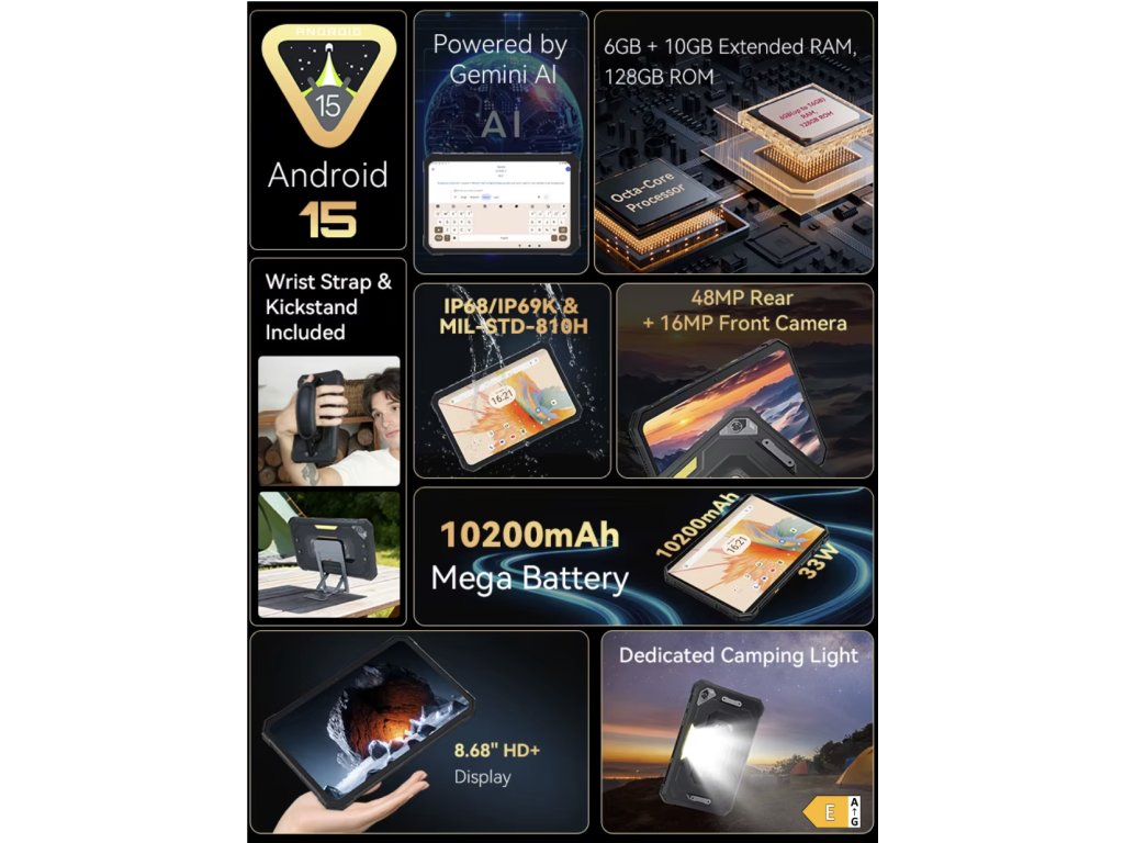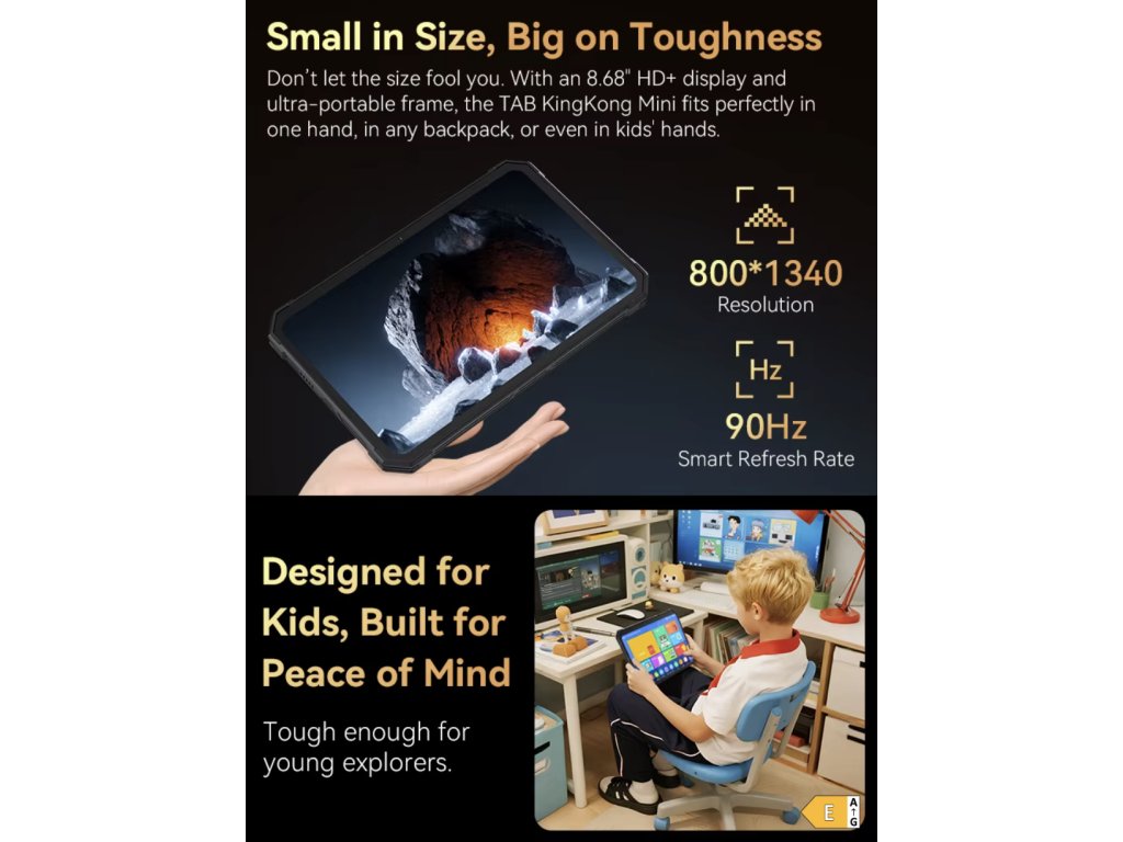 Das Cubot KingKong MiNi ist ein Tablet, das für den Einsatz unter härtesten Bedingungen entwickelt wurde. Dank seines kompakten Designs passt es bequem in die Hand und Tasche und bietet gleichzeitig Widerstandsfähigkeit gegen Staub, Wasser, Stürze und extreme Temperaturen. Zertifikate IP68 / IP69K und eine Militärnorm MIL-STD-810H bestätigen, dass dieses Gerät auch unter den härtesten Bedingungen funktioniert – vom Baustellengelände über Lager bis hin zu Outdoor-Expeditionen.